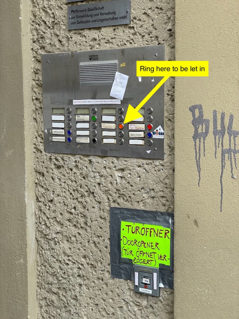 Der Türöffner, der sich unter den Klingeltasten befindet, funktioniert an den Wochenenden nicht. Sie müssen also klingeln und darauf warten, dass Sie jemand hereinbimmelt!